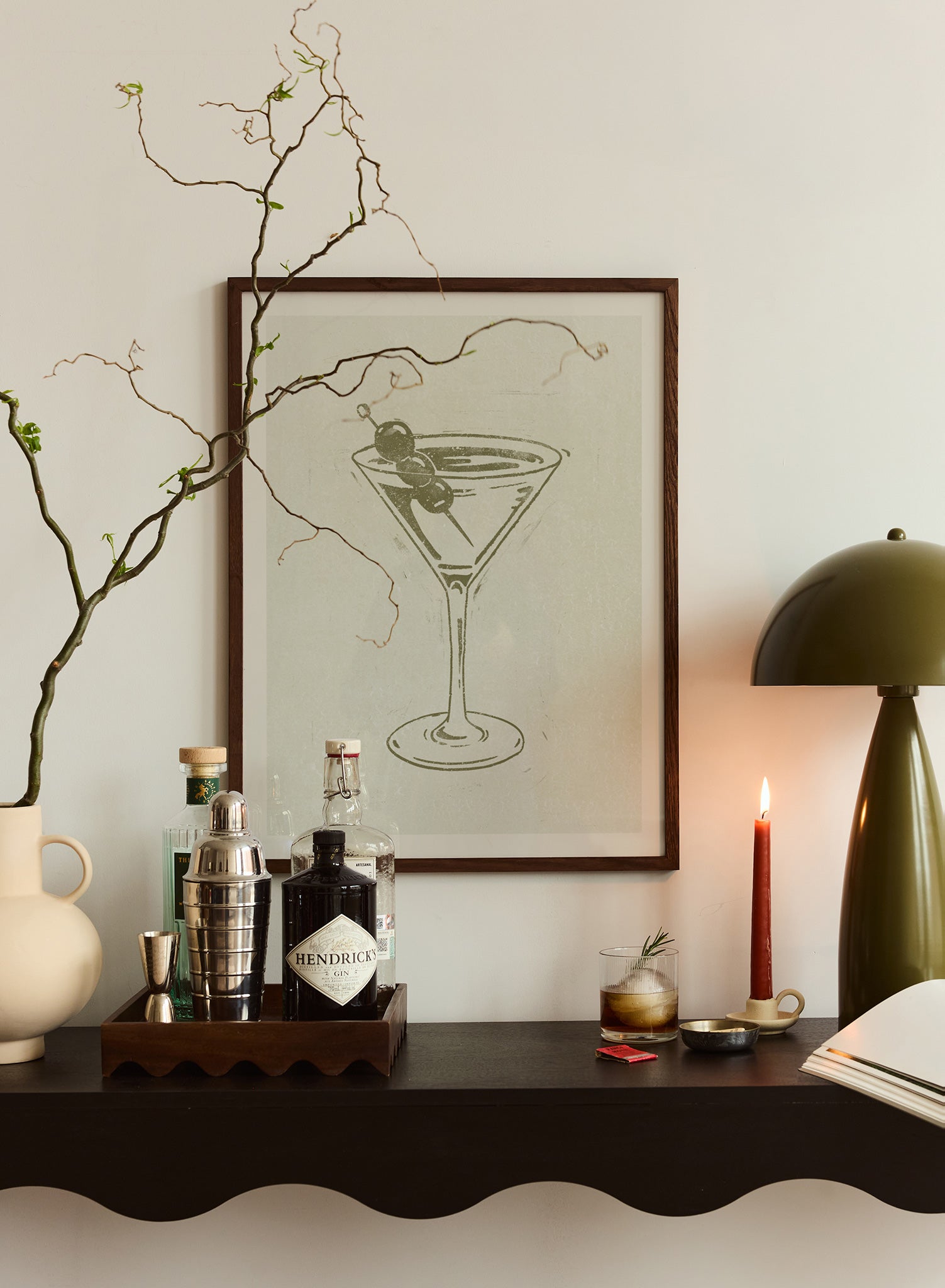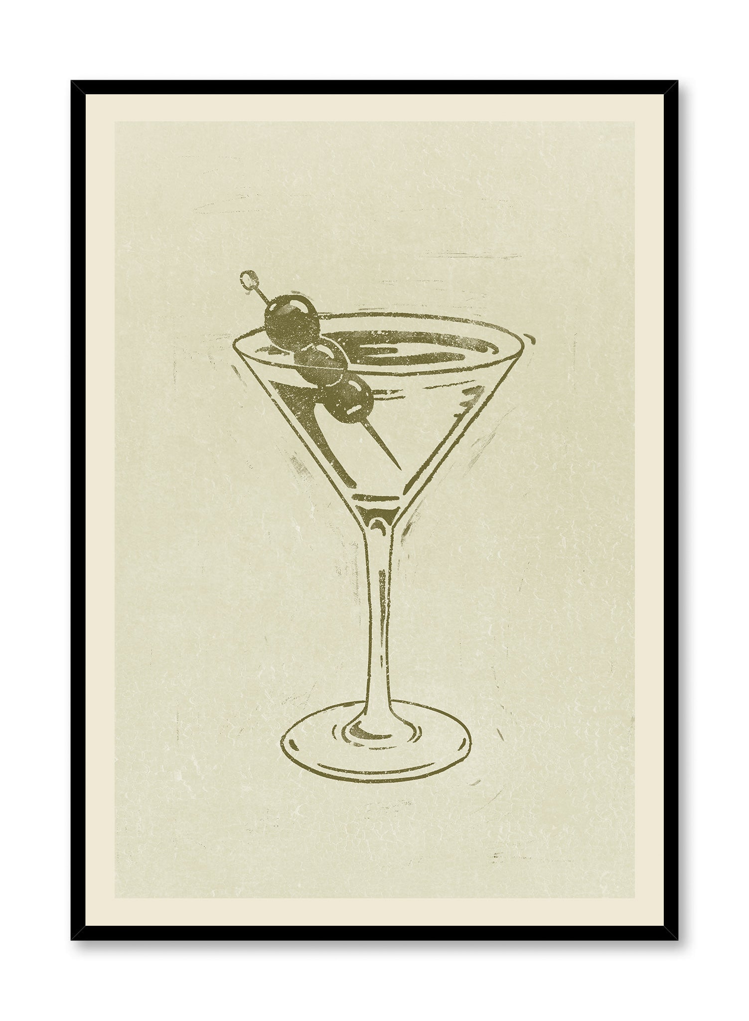 This art print is an elegant and minimalist tribute to the classic Martini. Rendered in a single shade of olive green, the iconic cocktail glass is garnished with two olives on a pick. The illustration style is reminiscent of a rustic linocut or woodblock print, with textured, imperfect lines that give it an artisanal and timeless quality.