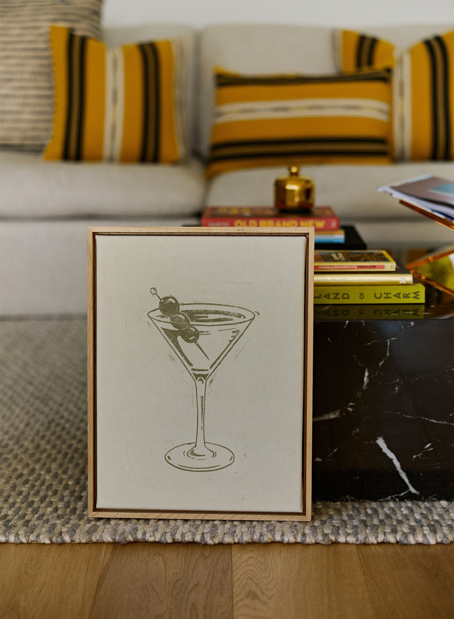 The beauty of this piece is its understated sophistication. The monochromatic color scheme is both modern and versatile, while the hand-printed aesthetic adds warmth and character. It’s a simple yet powerful design that celebrates the enduring appeal of one of the world’s most famous cocktails.