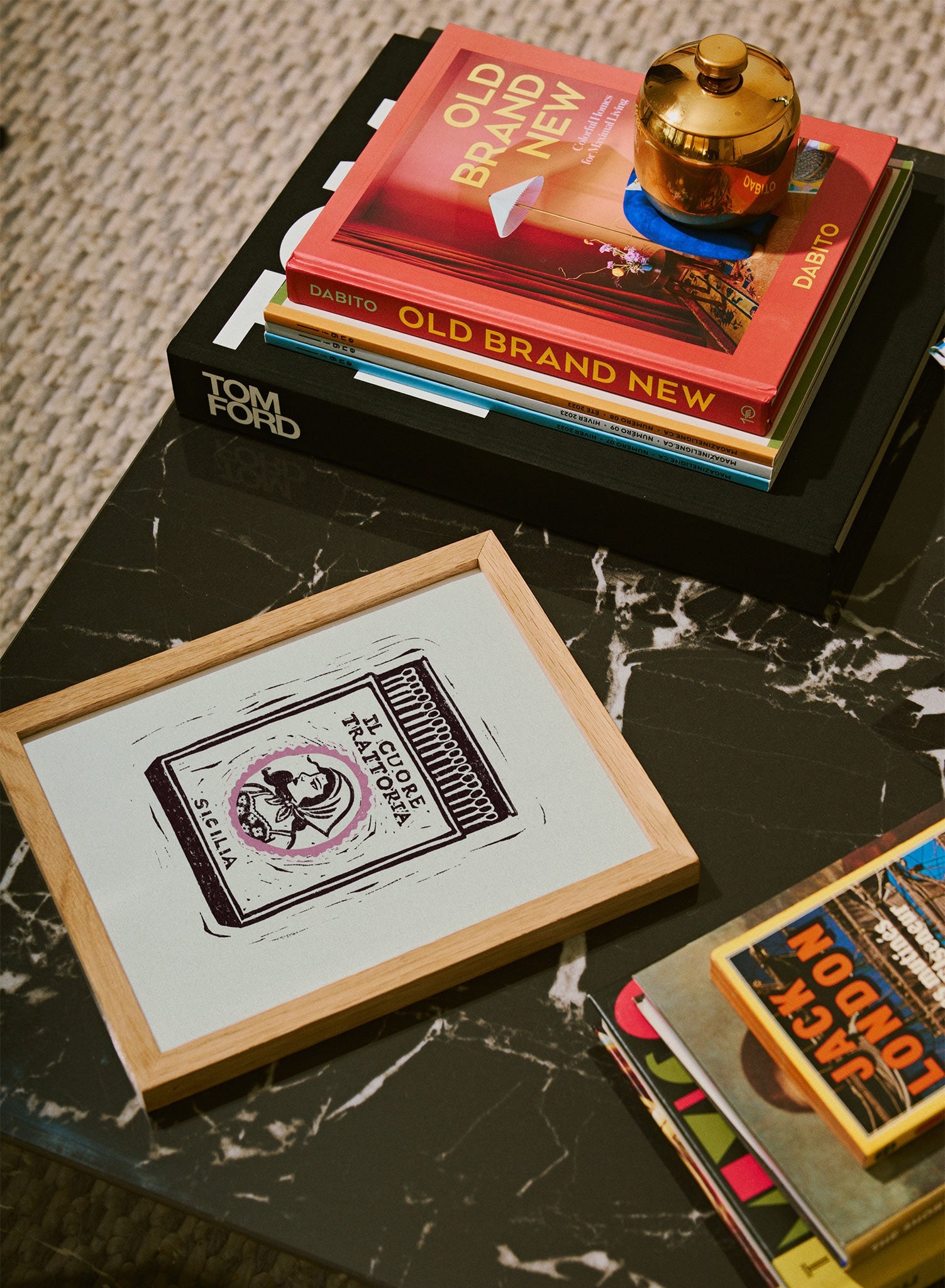 This linocut print features a vintage-style matchbook from a fictional Sicilian restaurant, 'Il Cuore Trattoria,' which translates to 'The Heart Trattoria.' The label shows a classic portrait of a woman in a headscarf, framed by a delicate pink oval. The hand-carved aesthetic gives the piece a rustic and soulful quality, evoking the warmth of a family-run Italian eatery.